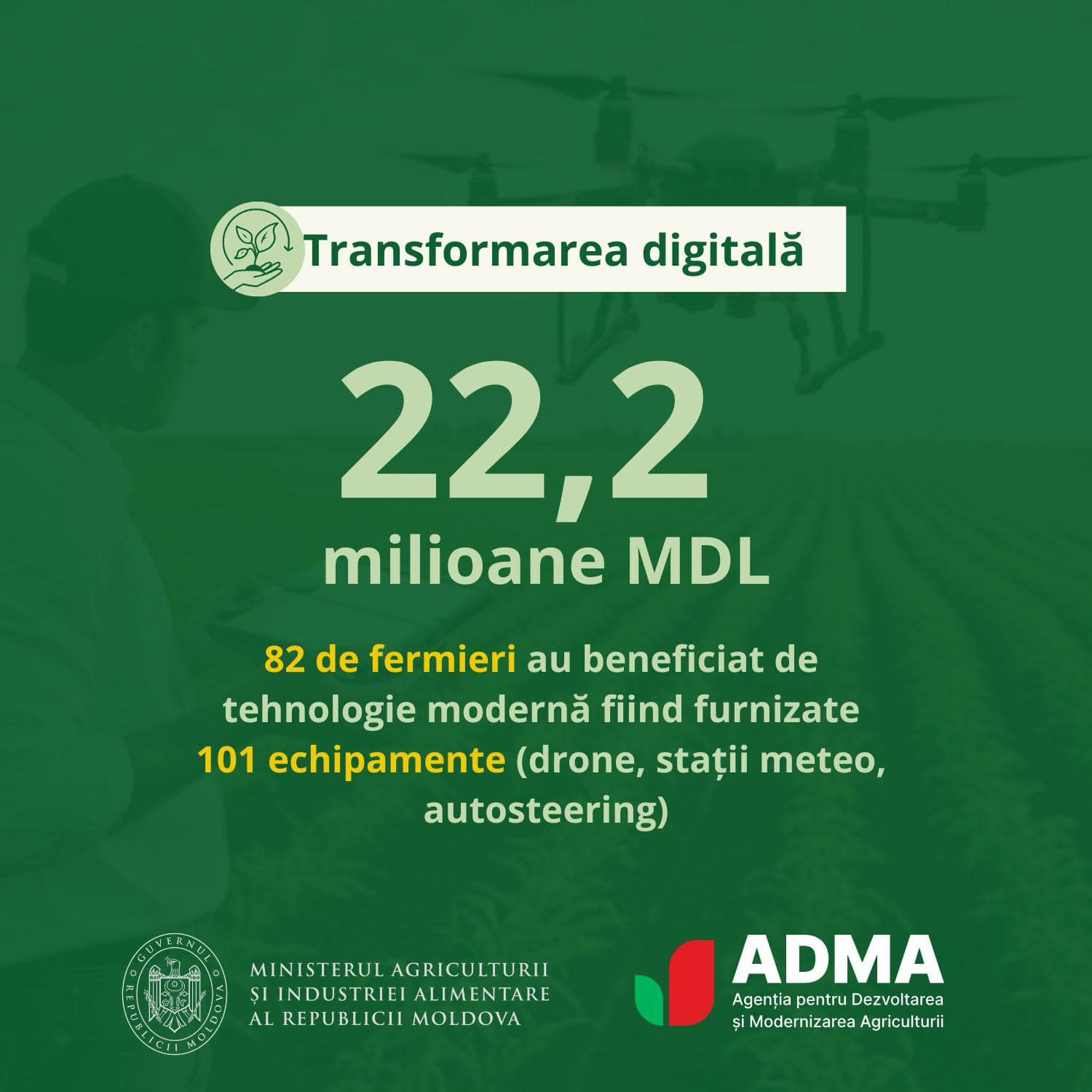 Agenția pentru Dezvoltarea și Modernizarea Agriculturii a fost creată pentru a fi alături de agricultorii din țară care își doresc să valorifice întregul potențial al noii generații de tehnologii și să investească în soluții care vor duce la accelerarea creșterii durabile a productivității agricole.