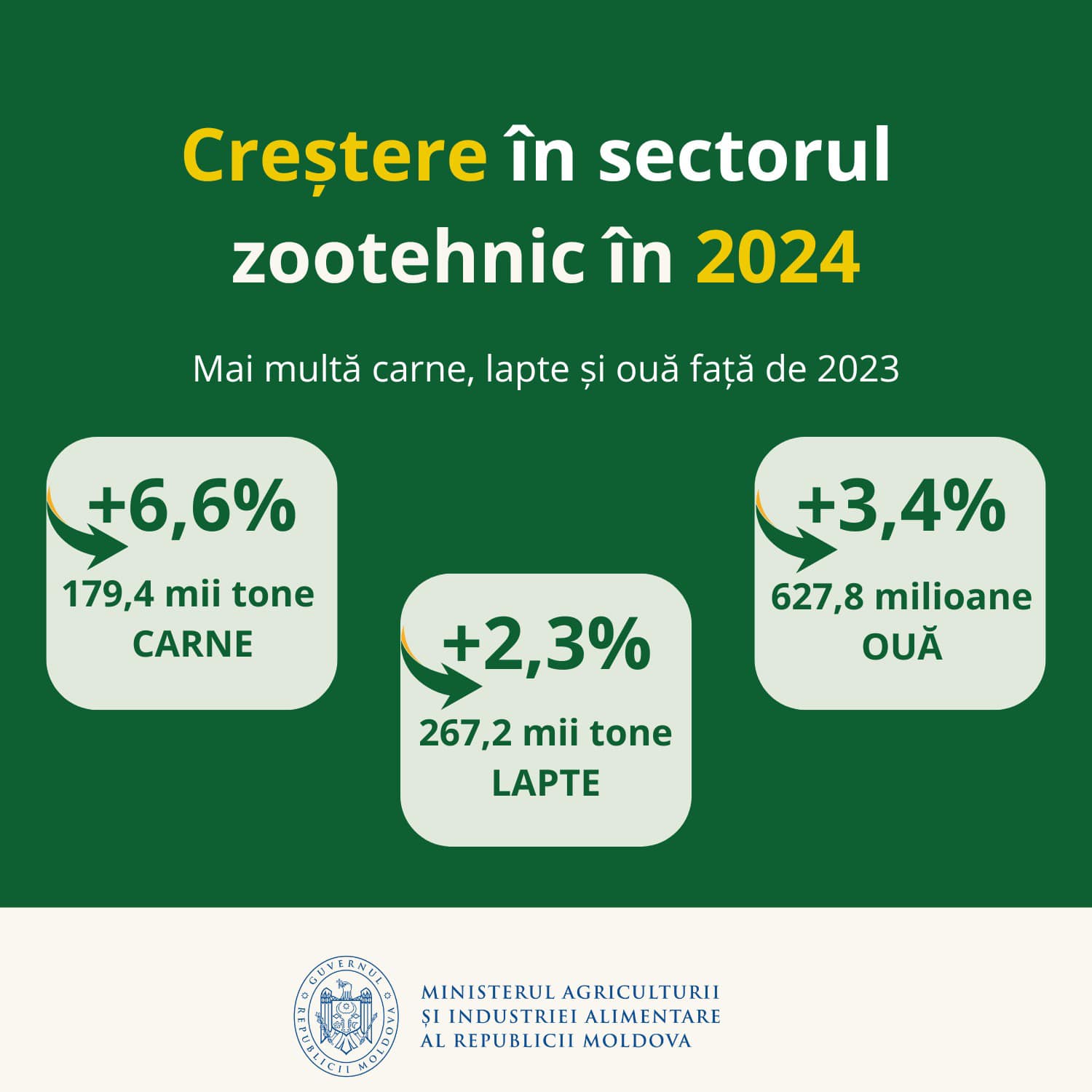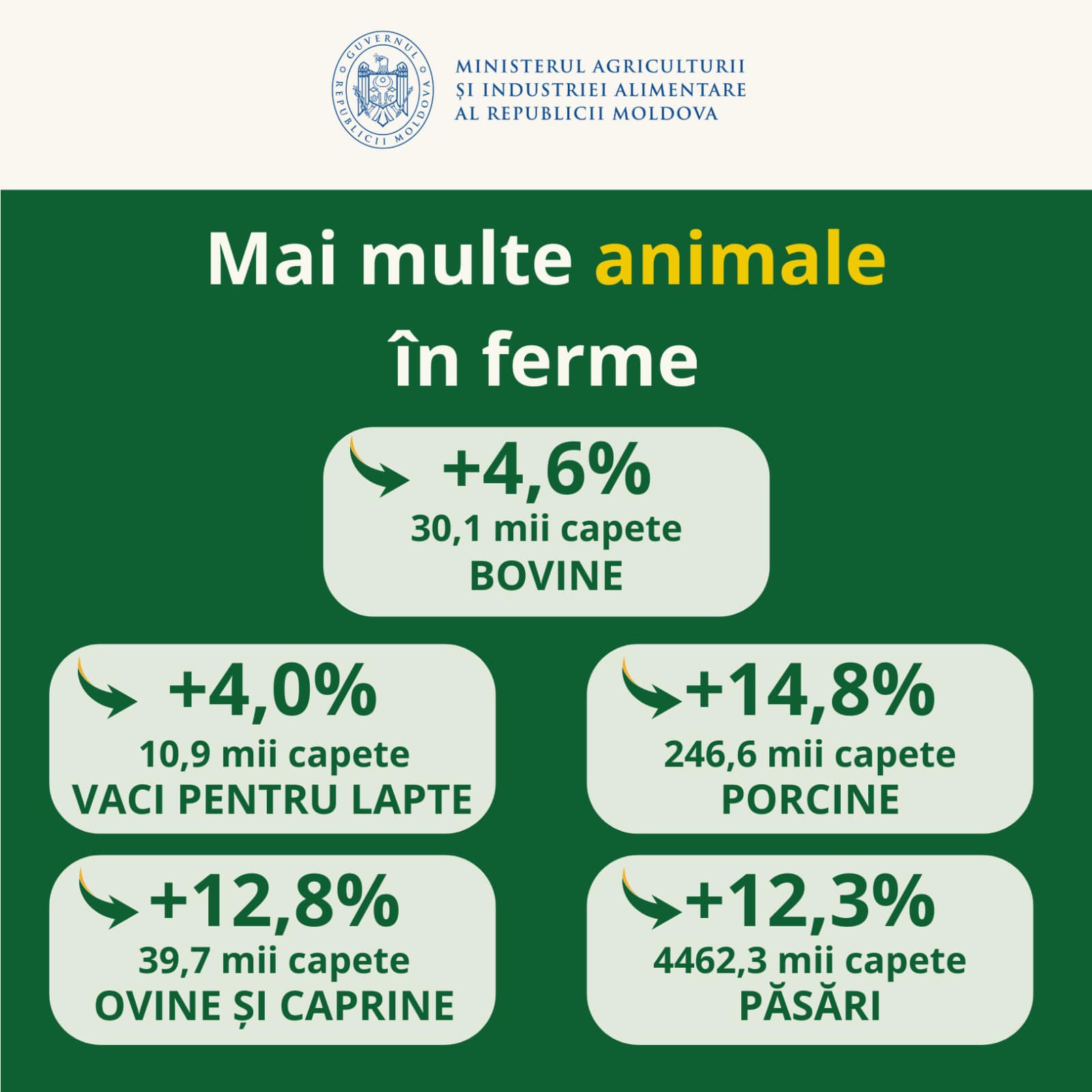 „Fermele zootehnice au demonstrat o capacitate sporită de dezvoltare și modernizare, înregistrând următoarele creșteri în producție: carne (masă vie) - 109 mii tone (+15,9%); lapte - 54,3 mii tone (+25,4%); ouă - 298 milioane bucăți (+8,6%)”, explică MAIA.