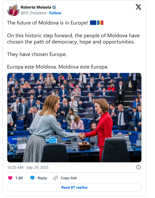 „Viitorul Moldovei este în Europa!”, a scris președinta Parlamentului European, Roberta Metsola, pe platforma X, subliniind că „poporul Moldovei a ales calea democrației, speranței și oportunităților”.