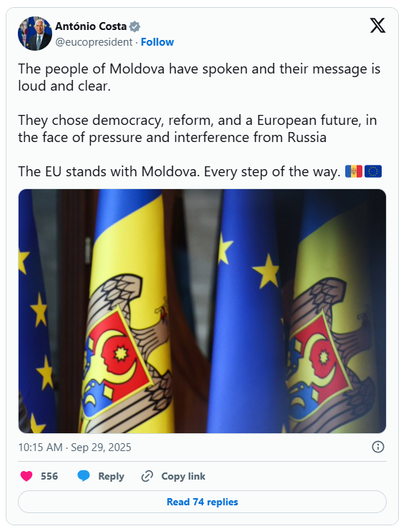 Președintele Consiliului European, Antonio Costa, a remarcat că „poporul Moldovei și-a exprimat votul, iar mesajul lor este clar și puternic. Ei au ales democrația, reforma și un viitor european, în fața presiunilor și interferențelor Rusiei”. Acesta a reiterat angajamentul Uniunii Europene: „UE este alături de Moldova. La fiecare pas de pe acest drum”.