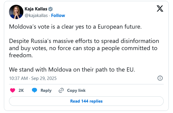 La rândul său, șefa diplomației europene, Kaja Kallas, a denunțat încercările Federației Ruse de a influența scrutinul. „În ciuda eforturilor masive ale Rusiei de a răspândi dezinformare și de a cumpăra voturi, nicio forță nu poate opri un popor angajat pentru libertate. Suntem alături de Moldova pe drumul lor către UE”, a afirmat aceasta.